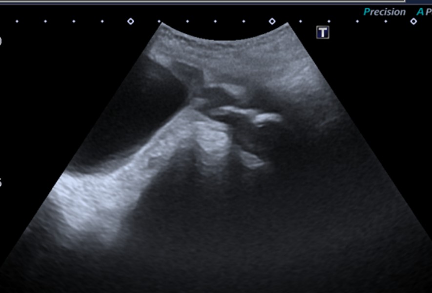 La ecografía ginecológica informa vejiga ampliada de contornos irregulares lateralizada a la derecha. En línea media, en probable topografía de vagina, se observan imágenes ecogénicas calcificadas con sombra acústica. La vagina mide 38 x 23 x 27mm (Imagen 6).